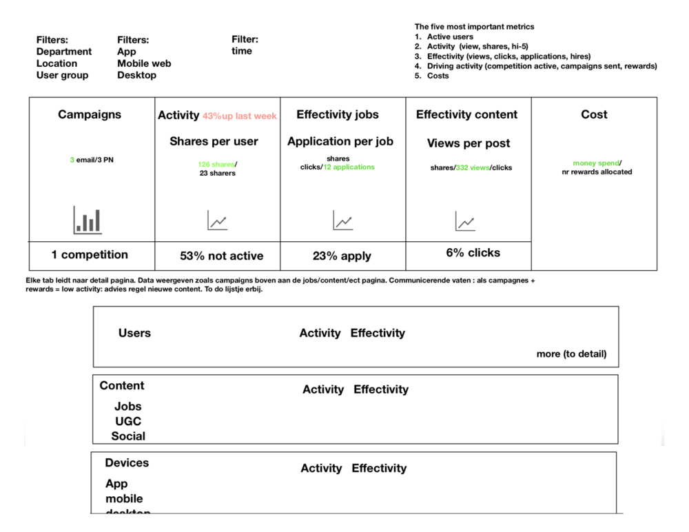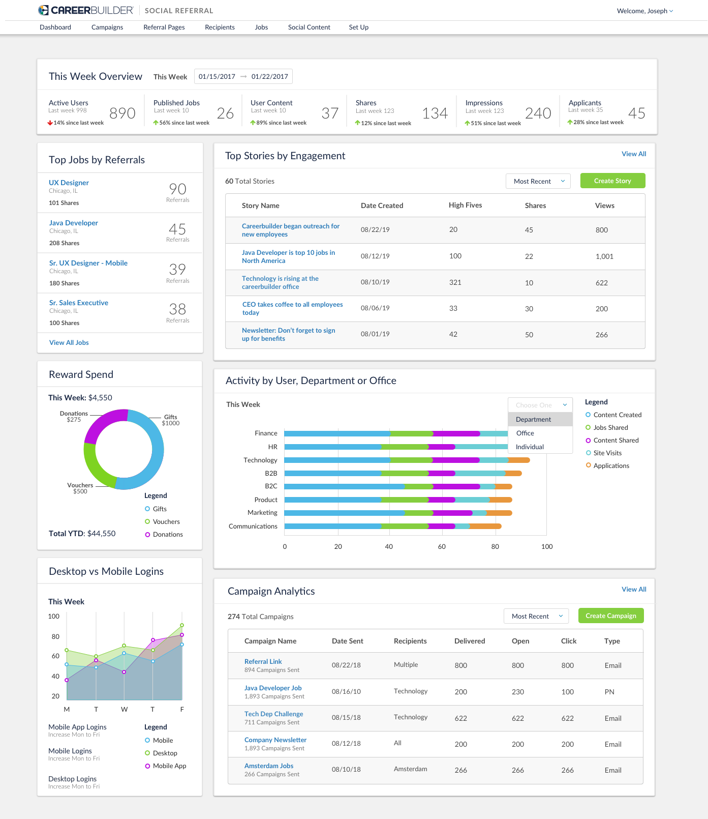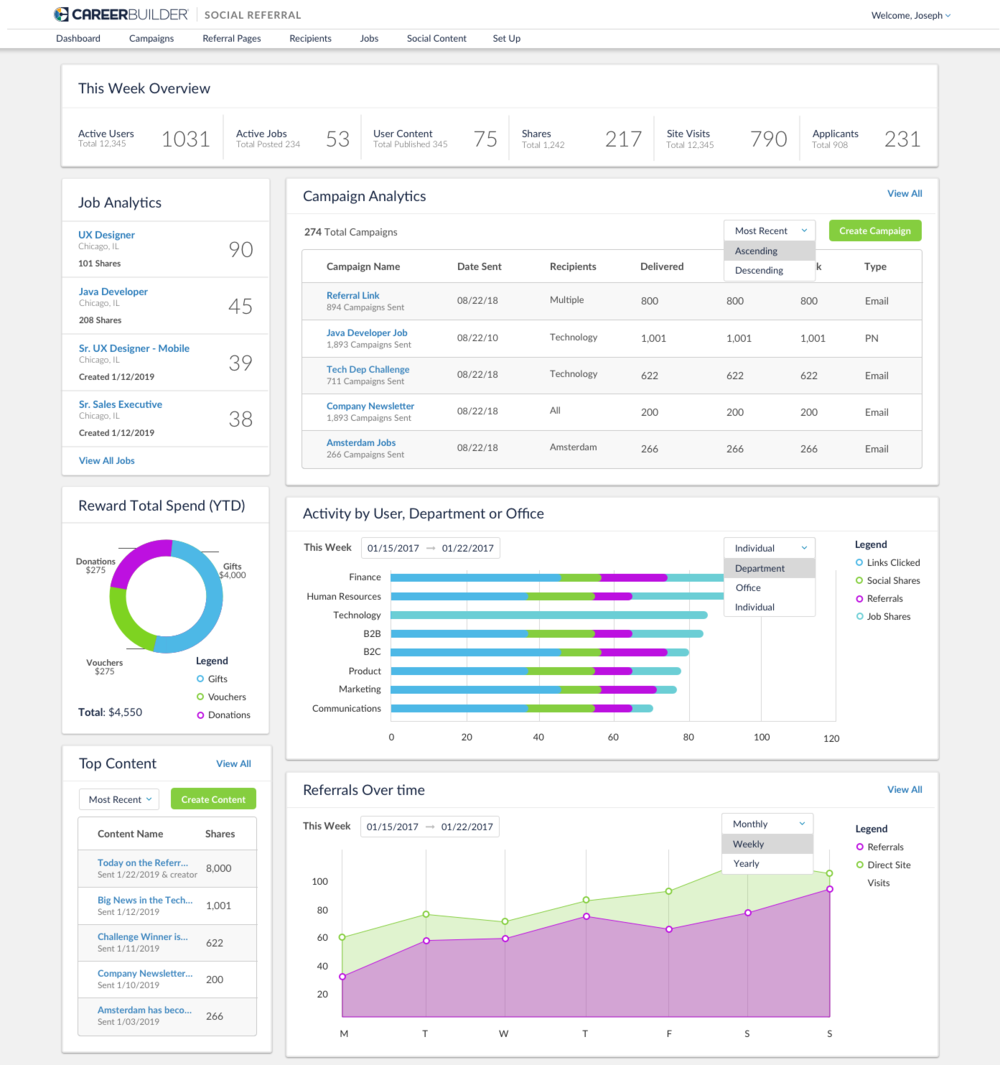User Activity: Admins need to see their users activity, whose sharing, receiving referrals, receiving rewards, winning competitions. They should also see total content shares, job shares, site visits, applicants, and content created throughout the week. All data should represent a βthis weekβ overview.